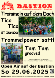 Das Open Air steigt am Sonntag, der 29. Juni 2025 und auch die Trommler von Tico Tico sind mit von der Partie. Wir trommeln von 19:00 bis 19:45 Uhr! Einlass ist um 18:30 Uhr, der Eintritt ist frei.