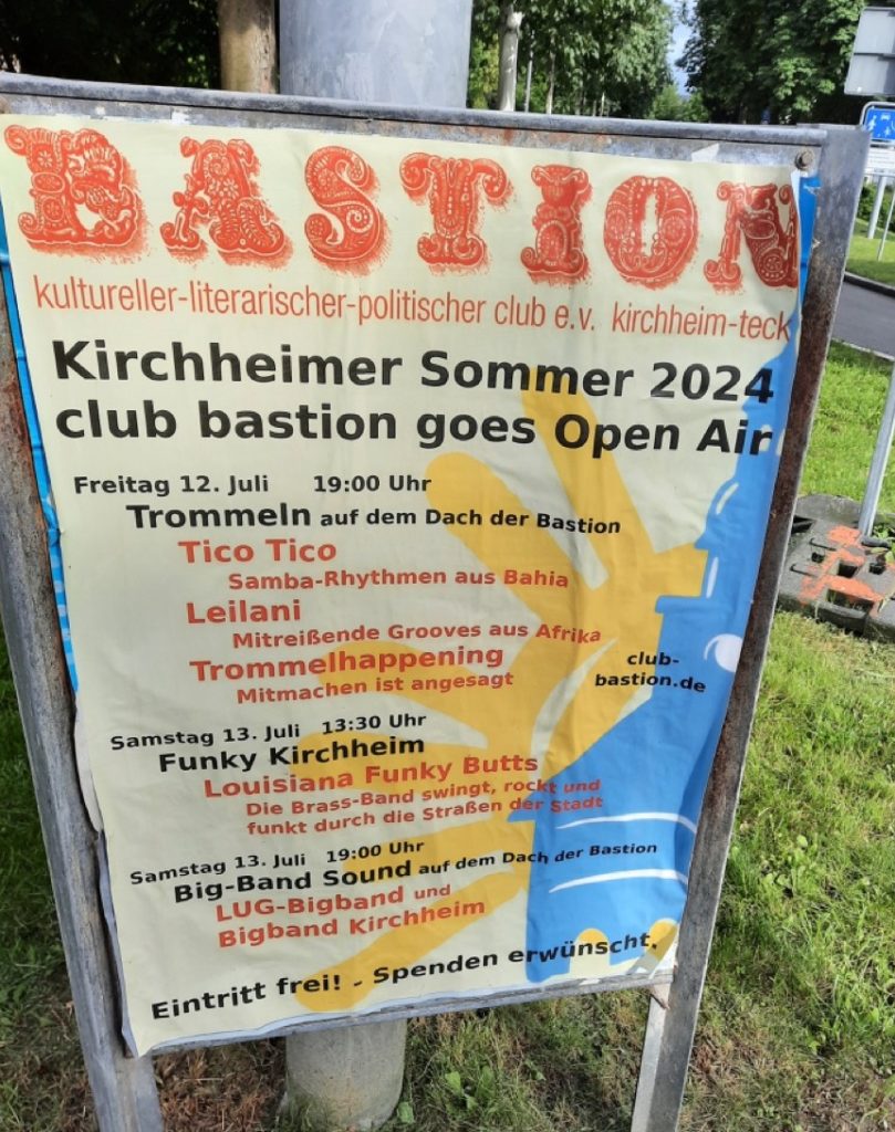 Nachdem das Trommeln auf der Bastion in Kirchheim letztes Jahr leider leider in letzter Minute abgesagt werden musst (Schiff, ahoi!) – klappt’s ganz sicher dieses Jahr: