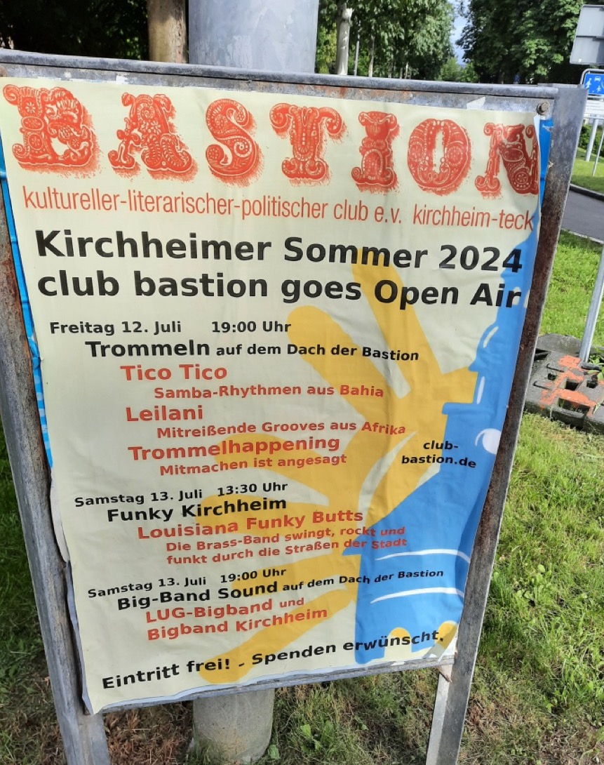 Am Freitag, 12. Juli 2024, erklimmen wir samt unserer Samba-Rhythmen das Dach der Bastion, um dort gemeinsam mit weiteren Trommlern zu spielen – ein Open Air über den Dächern Kirchheims. Wow!