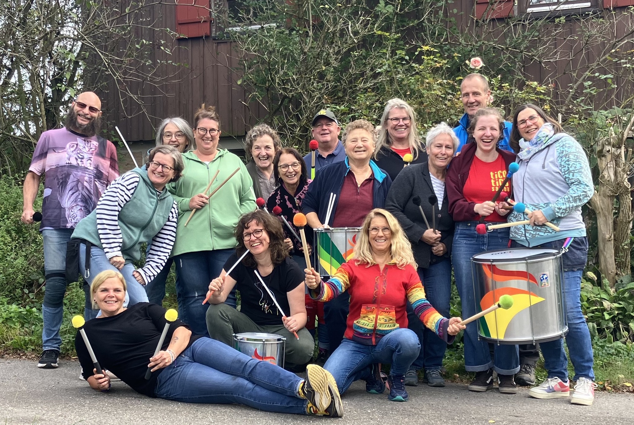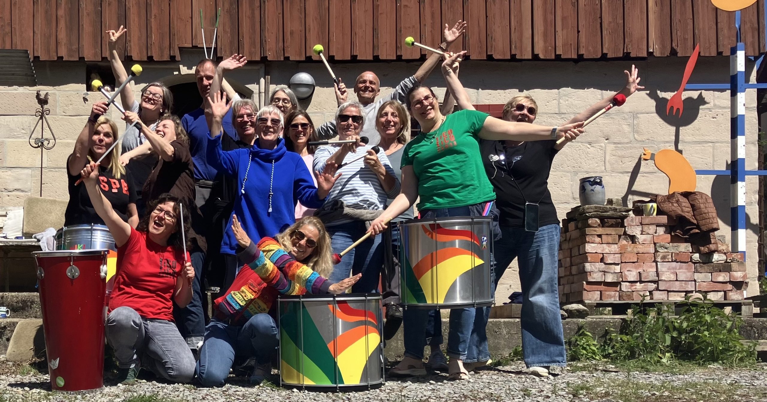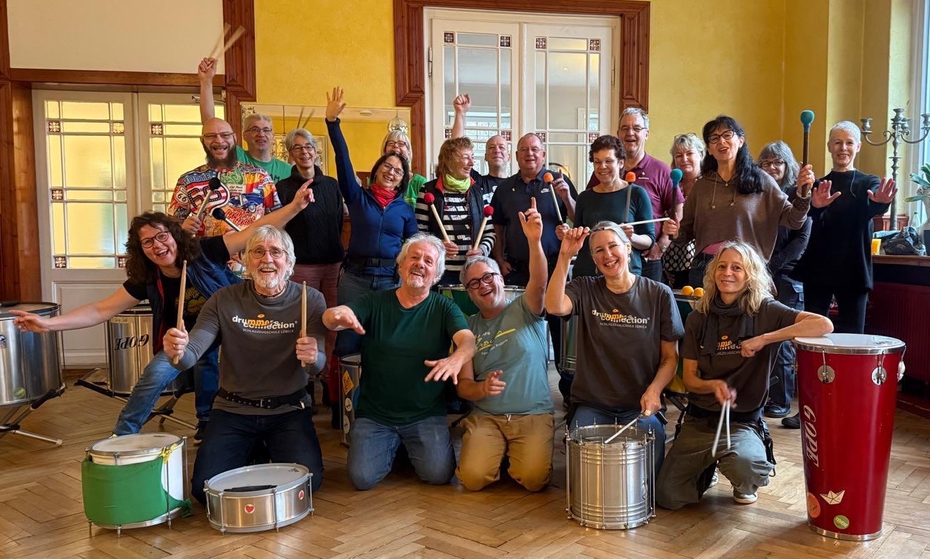 Während sich die Öffi-Gruppe in Hamburg von Kaffee zu Kaffee und Zughoffnung zu Zughoffnung hangelte, versuchte Team Auto in der Musikakademie die fehlenden Sambistas auszugleichen – mit dreifachem Trommelspaß … Trommeln waren ja mehr als genug vor Ort. 😬