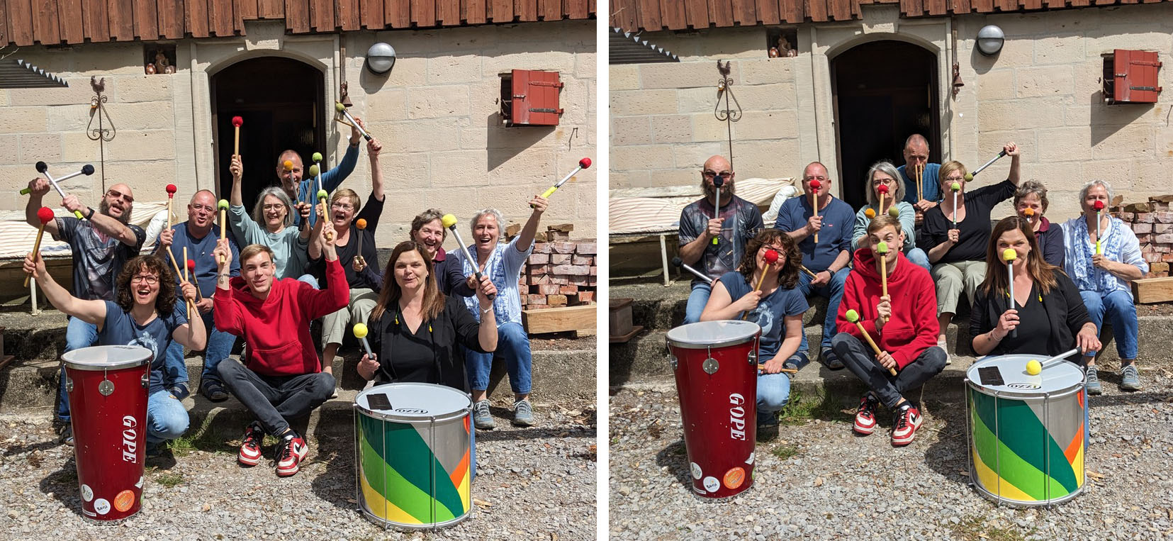 Unser erster Bauernhof-Workshop in diesem Jahr fand gewagterweise schon Ende April statt – tschakka, bei gutem Wetter. Und hey: Viel haben wir getrommelt und ein komplettes Stück geschafft … O Barco Vai!