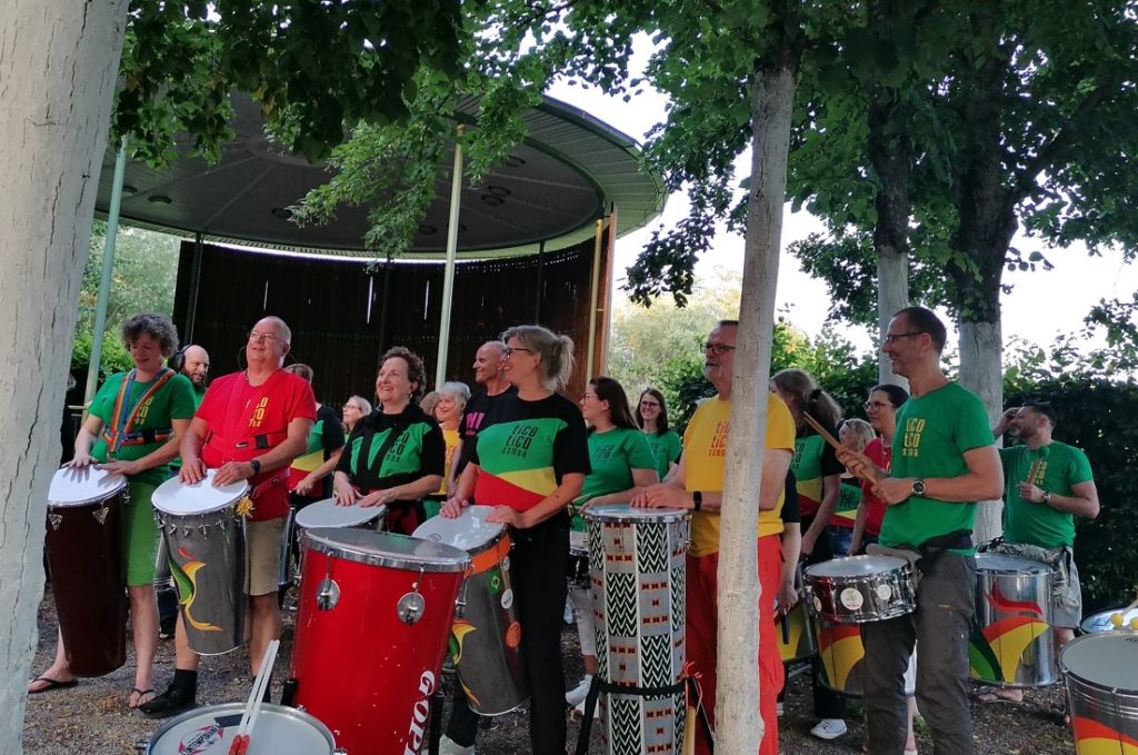 Auch zwei Berimbao-Gruppen – eine aus Ebersbach/Fils, eine aus Stuttgart – brachten brasilianischen Sound in den „Samba-Biergarten“ von Steiner am Fluss in Plochingen. Und auch unsere Freunde und Kollegen von den PinkBeats aus Stuttgart gestalteten den Abend eindrucksvoll – mit ihren afro-brasilianischen Rhythmen und Klängen, mal laut und mal wunderbar leise.